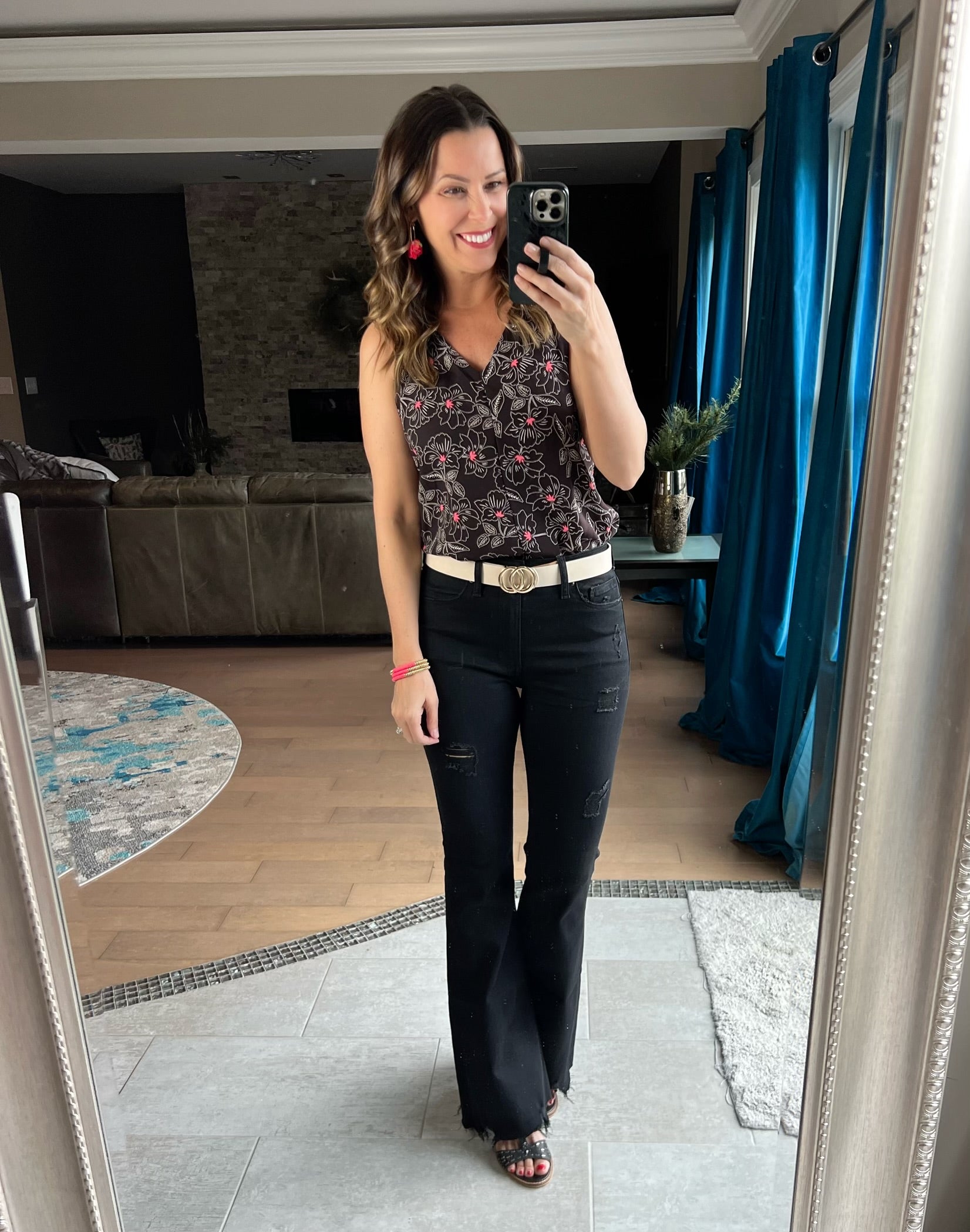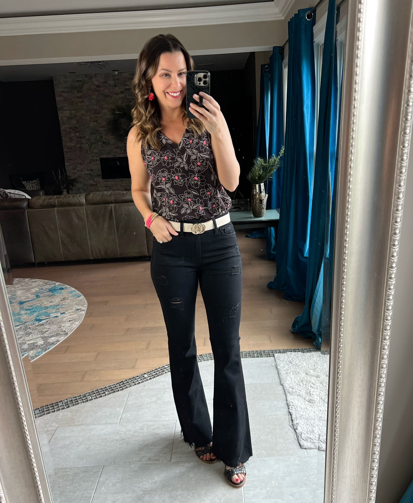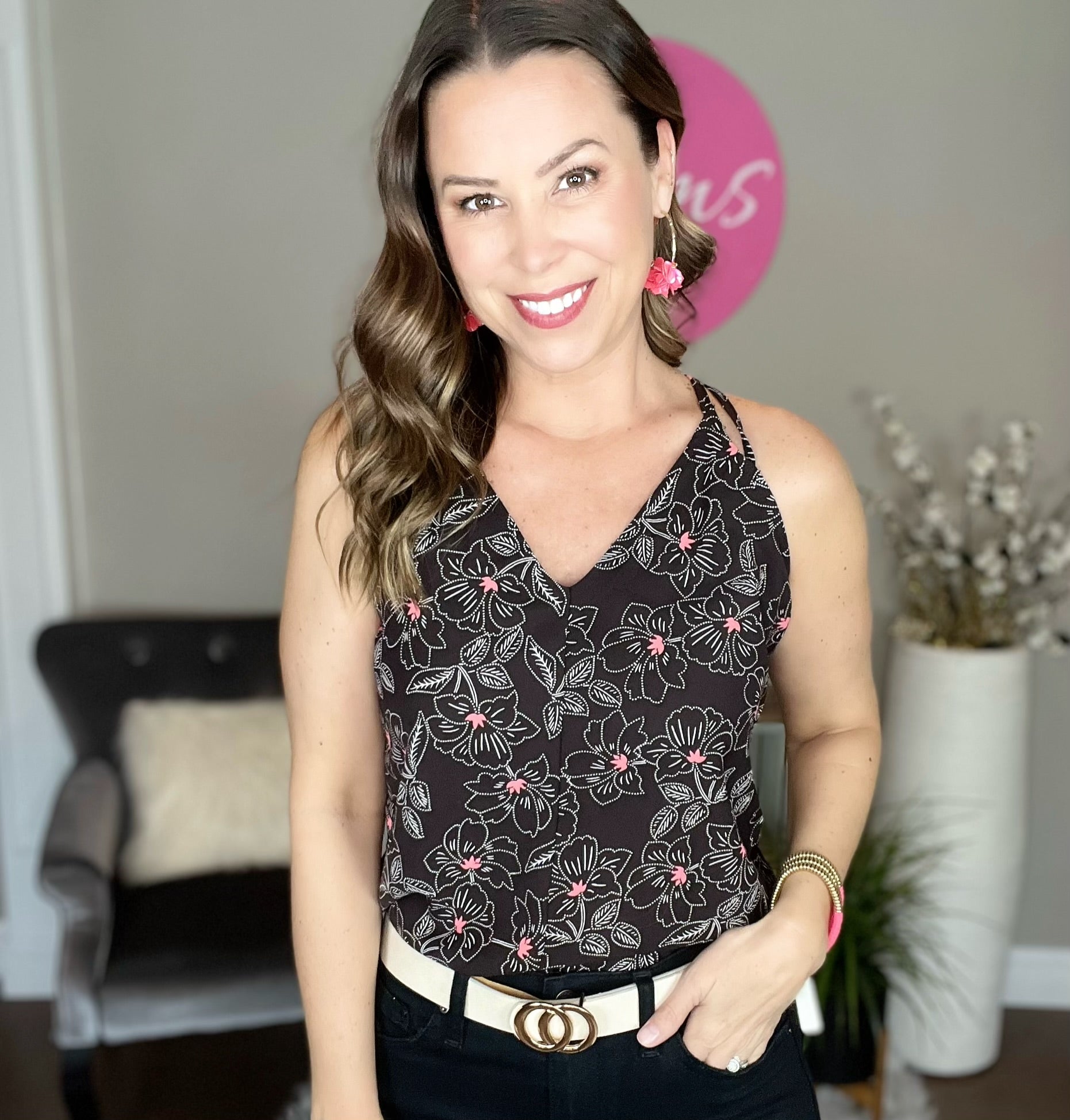 Black Floral Print Spaghetti Strap Racerback Tank Top