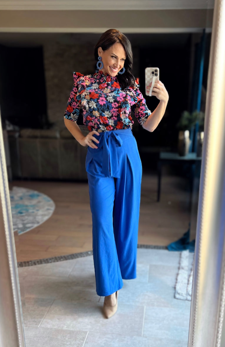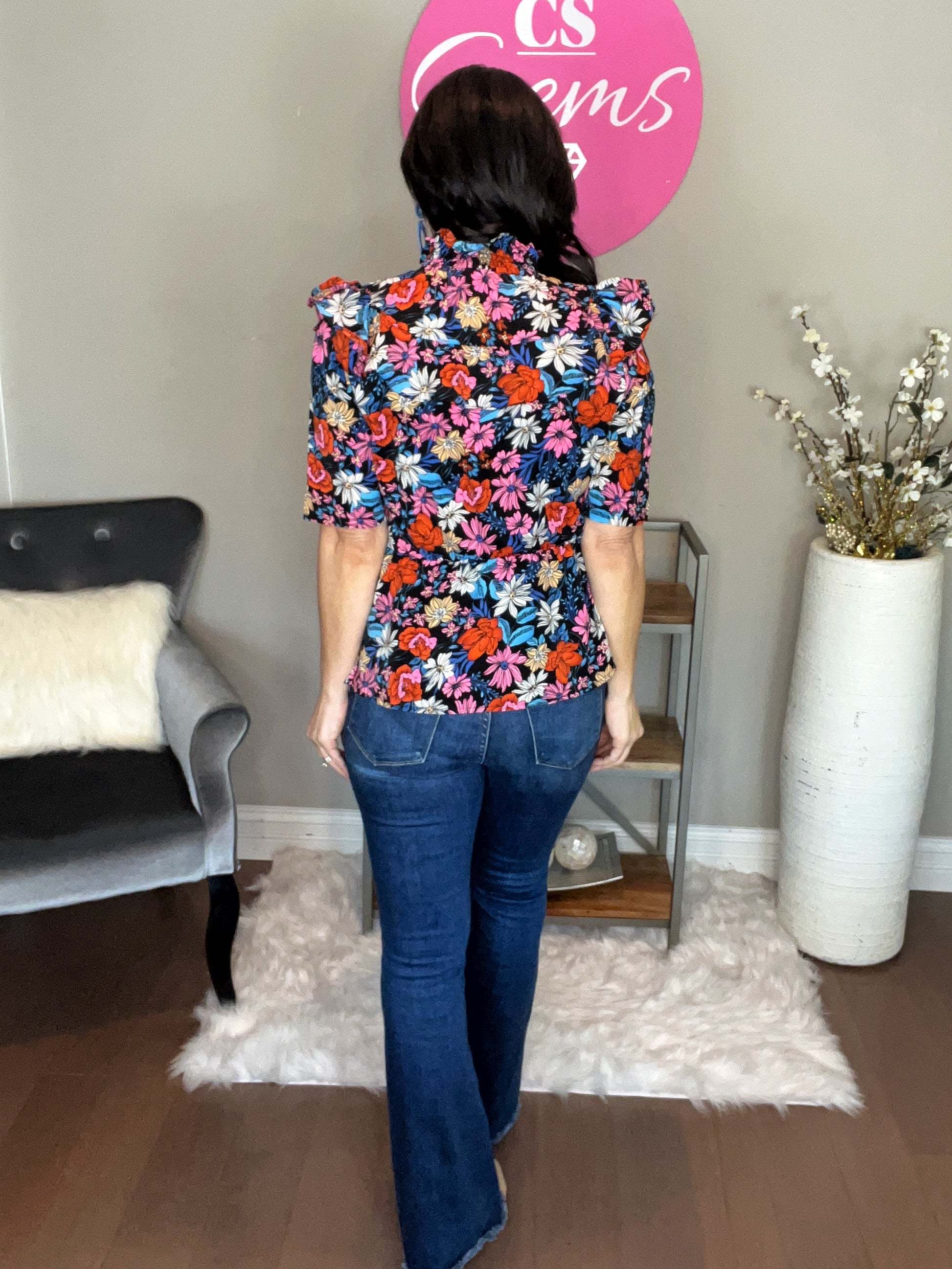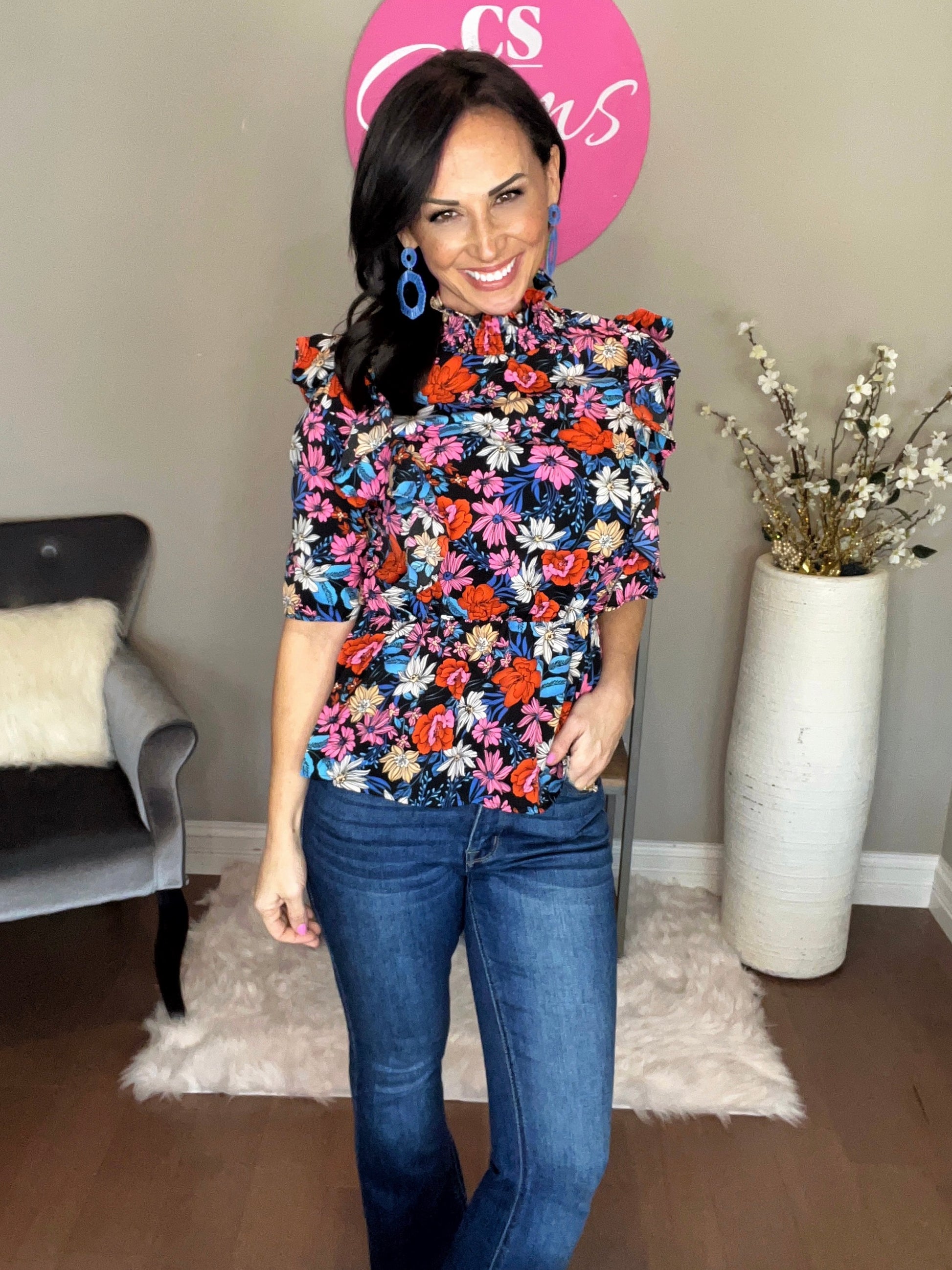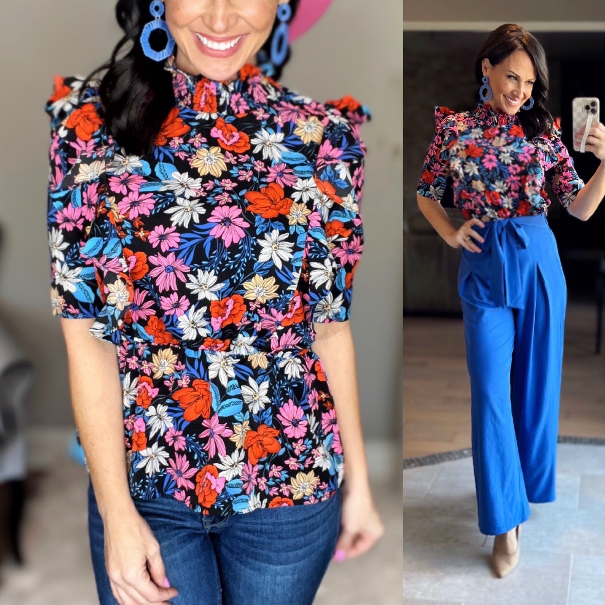 Colorful floral print Lightweight woven Mock neckline with smocking Short sleeves with ruffle detail Elastic around waistline Peplum hem Relaxed fit 100% Polyester