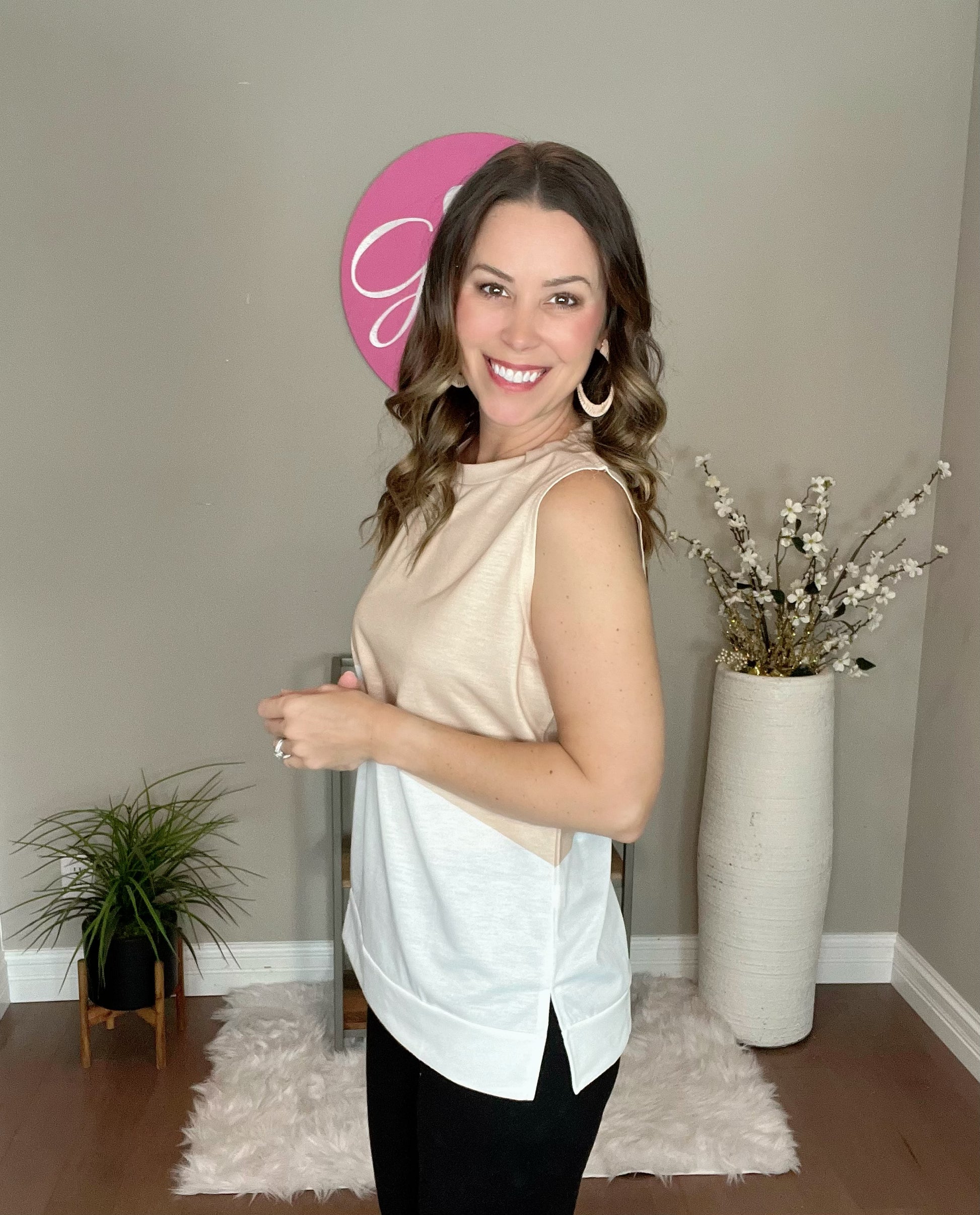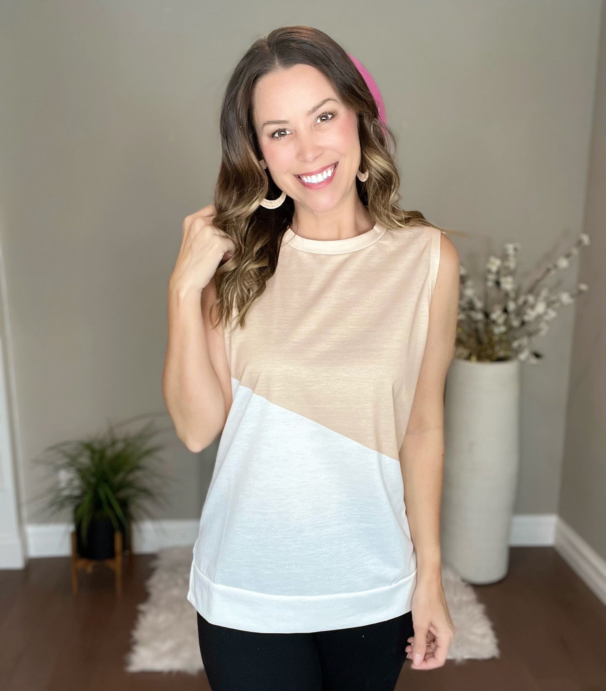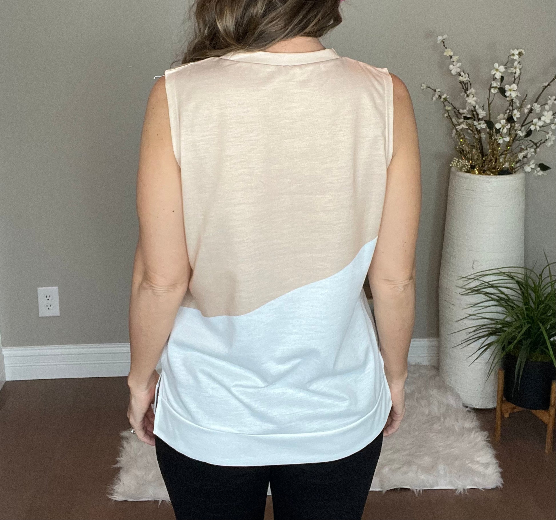 Make a statement with our Sleeveless Crew Neck Color Block Top. Bold, asymmetrical color blocking meets timeless style in this wardrobe essential. Perfect for layering or wearing solo, its versatile design effortlessly transitions from casual days to chic nights out, ensuring you stay on-trend and comfortable wherever you go