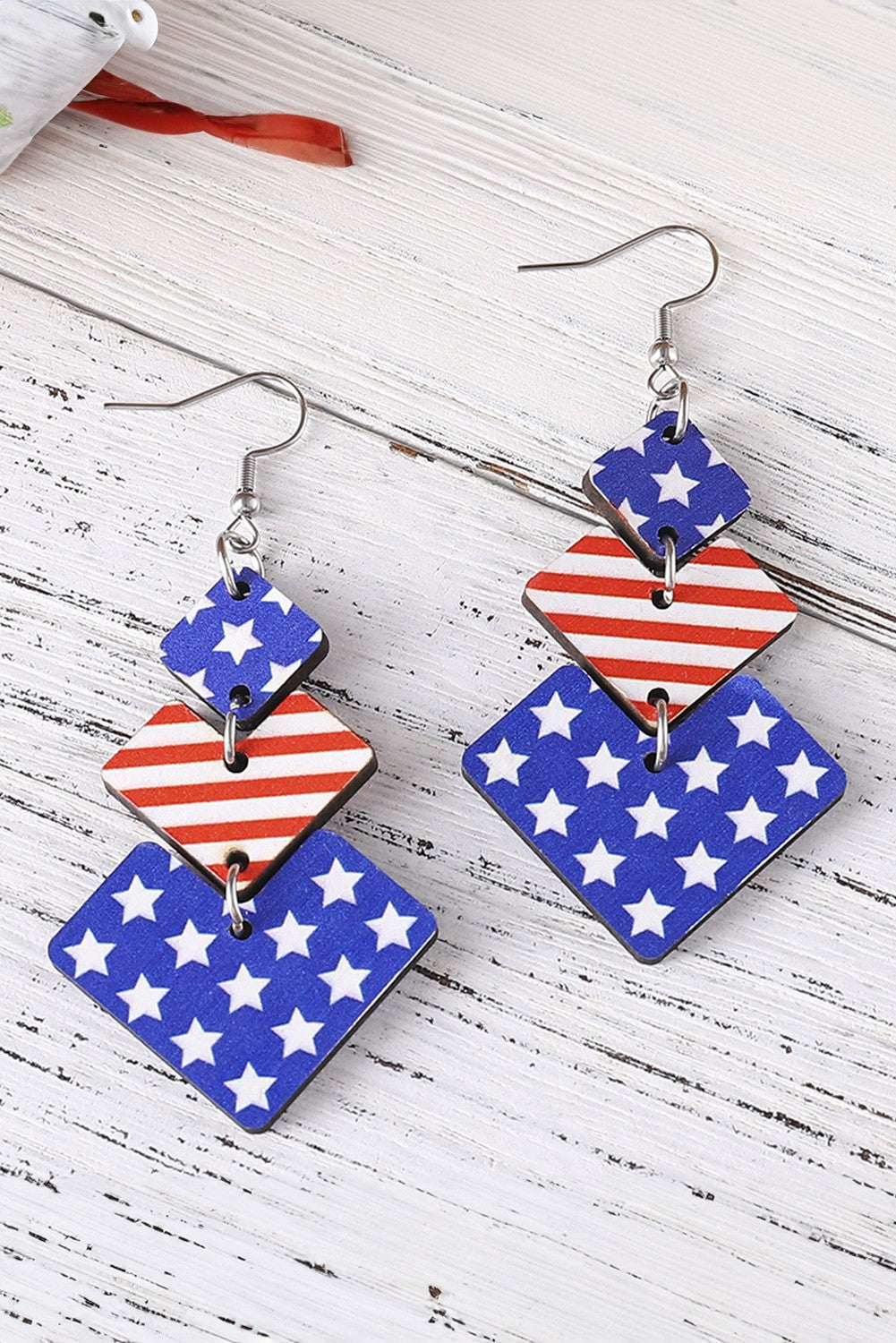Geometric Wooden Star Stripe Flag Dangle Earrings