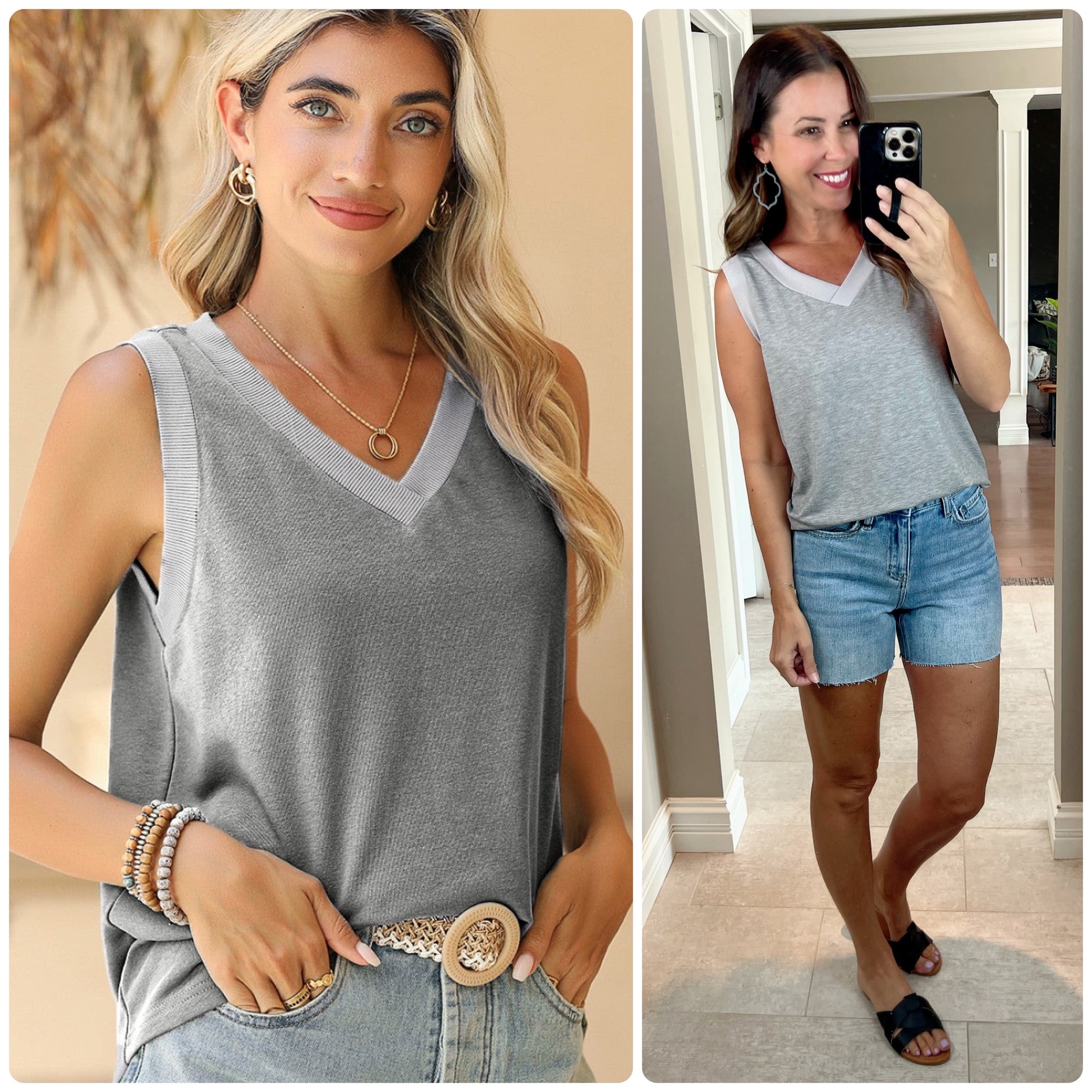 Grey Contrast Trim V-Neck Loose Fit Tank Top